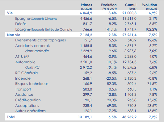 Le cumul des primes encaissées, lors des 3 premiers trimestres 2024 était de 45 milliards de dirhams. Fin 3ème trimestre 2025, nous avons dépassé les 48 milliards. Avec les chiffres derière la virgule, c’est une augmentation de 7,2%. Même tendance sur les résultats du 3ème trimestre 2025 par rapport à celui de 2024, on enregistre une augmentation de 6,5%. Plus de 13 milliards ont été encaissés ce 3ème trimestre.