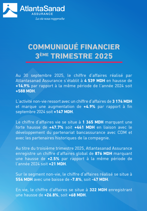 ​A noter, qu’au 30 septembre 2025, le chiffre d’affaires réalisé par Atlantasanad Assurance s’établit à 4 539 MDH en hausse de +14.9% par rapport à la même période de l’année 2024 soit