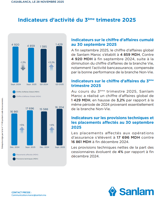 Au troisième trimestre 2025, Sanlam Maroc a réalisé un chiffre d’affaires global de 1 429 MDH, enregistrant une progression de 3,2% par rapport à la même période en 2024. Cette croissance est principalement portée par la branche Non-Vie, qui continue de soutenir activement la dynamique commerciale du groupe sur le marché marocain. Le contexte est particulier pour la compagnie qui enregistre une diminution de la bancassurance dans ses résultats, et qui malgré cela, réalise un bon résultat global.