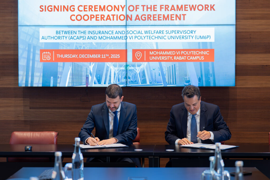 L’Autorité de Contrôle des Assurances et de la Prévoyance Sociale (ACAPS) et l’Université Mohammed VI Polytechnique (UM6P) ont signé, jeudi 11 décembre à Rabat, un important cadre-accord de coopération. Ce partenariat vise à renforcer les compétences, encourager la formation continue, développer la recherche scientifique et promouvoir l’éducation financière au service du secteur des assurances et de la prévoyance sociale.