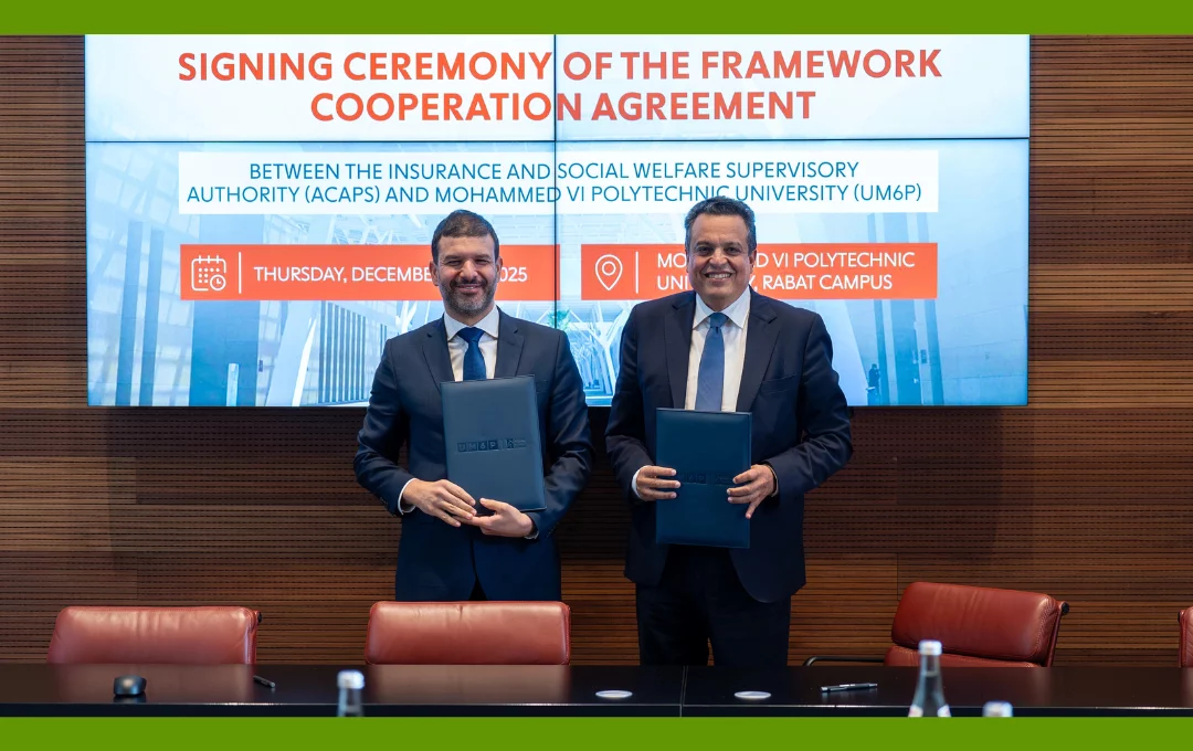L’Autorité de Contrôle des Assurances et de la Prévoyance Sociale (ACAPS) et l’Université Mohammed VI Polytechnique (UM6P) ont signé, jeudi 11 décembre à Rabat, un important cadre-accord de coopération. Ce partenariat vise à renforcer les compétences, encourager la formation continue, développer la recherche scientifique et promouvoir l’éducation financière au service du secteur des assurances et de la prévoyance sociale.