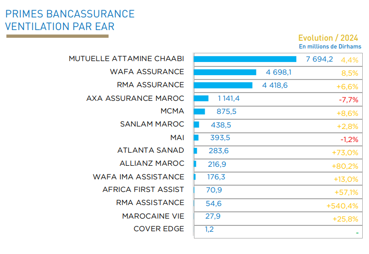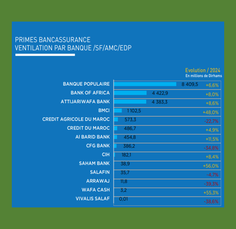 Banque Populaire domine avec 8,4 Mdhs de primes (41,1% du total), suivie de Bank of Africa (4,4 Mdhs) et Attijariwafa Bank (4,4 Mdhs). Les commissions grimpent de 16,3% à 569,4 millions de dirhams, Banque Populaire en tête à 170,5 millions.