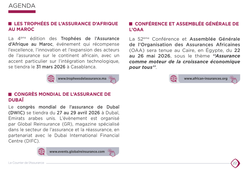 Sur le front réglementaire, l’édition évoque l’amendement du Dahir de 1984 sur les accidents corporels, de nouveaux critères de tarification RC auto, et les progrès vers la Solvabilité Basée sur les Risques (SBR) alignée sur les normes IFRS. Elle aborde aussi l’Assurance Maladie Obligatoire (AMO), le transfert des assurés de l’article 114 vers la CNSS, et les débats sur l’assurance habitation face aux risques climatiques accrus.